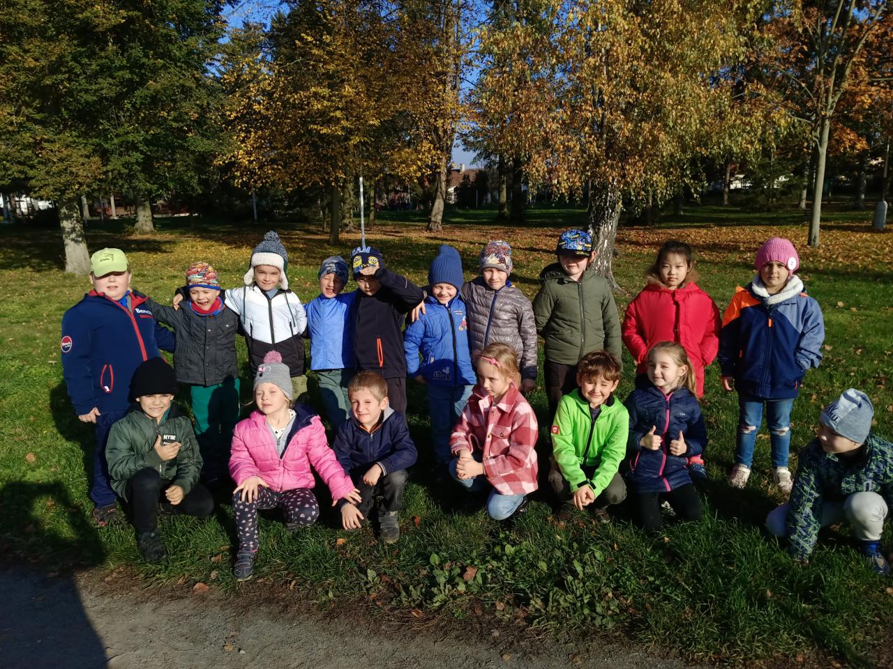 Tento týden jsme se také jednoho slunečného dne vydali na podzimní vycházku. Cestou jsme pozorovali podzimní změny v přírodě a povídali si o nich. Vymýšleli jsme slova začínající na pro nás známá písmena. Cestou jsme s radostí mávali kamarádům z mateřské školy.