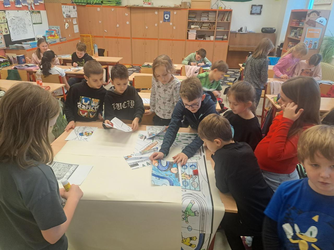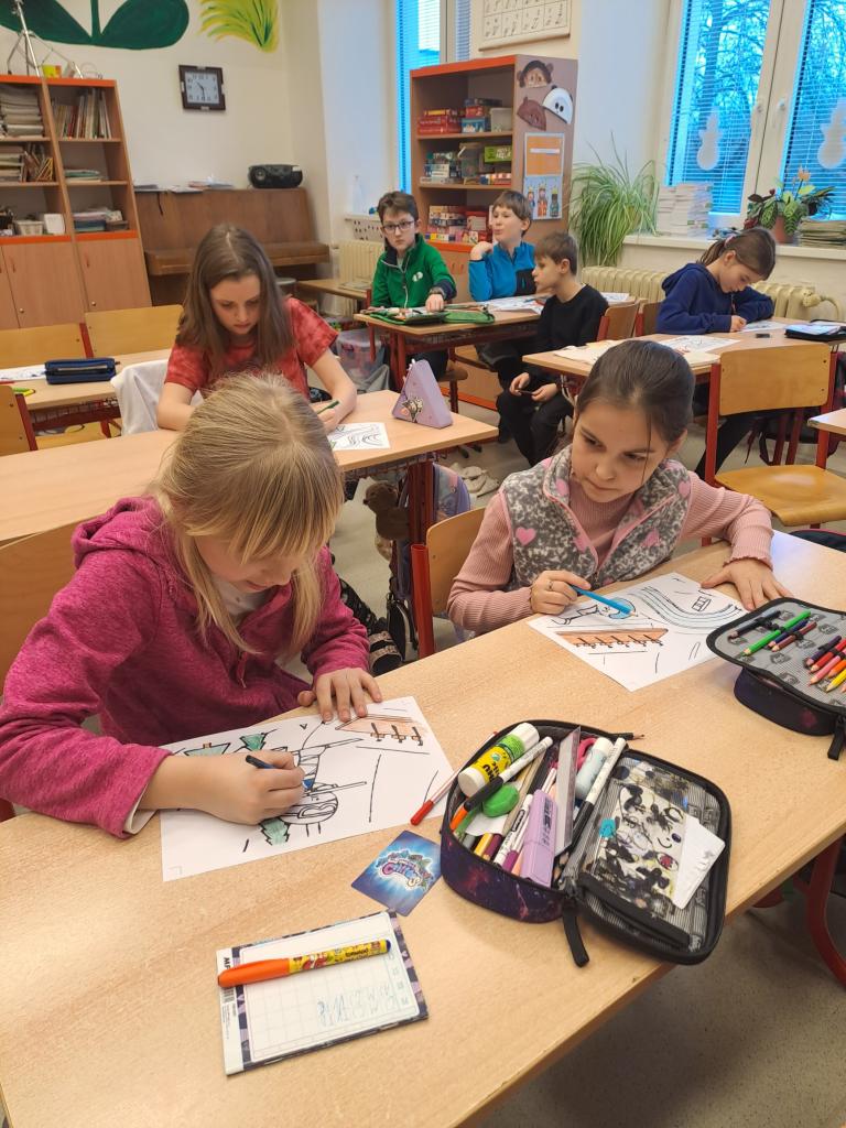 Kooperativní obraz na téma zimní sporty a jeho tvorba zaměstnala celou třídu. Žáci s radostí a se vzájemnou spoluprací tvořili velkoformátový obraz. Nezapomněli doplnit již získané medaile.