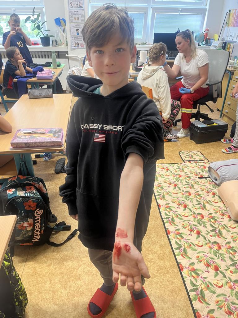 Na závěr lektorka dětem realisticky namaskovala různá zranění a společně s nimi rozebírala, jak je ošetřit a jak reagovat v daných situacích.