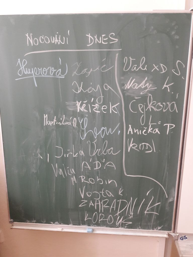 návštěva dálniční policiepolicejní vybavení na cestysvačinka na cestěskorokonec roku...budeme nocovat a čekat na PEŽÁKA7.B vypadá unaveně....to určitě půjdou brzy spát...jasně...ještě není půlnoc a oni cchtějí jít na kutěrozcvička před spanímležištěradostné vítání nového dnepracovní terapie po spaní ve škole PRACUJÍ VŠICHNI