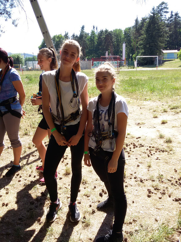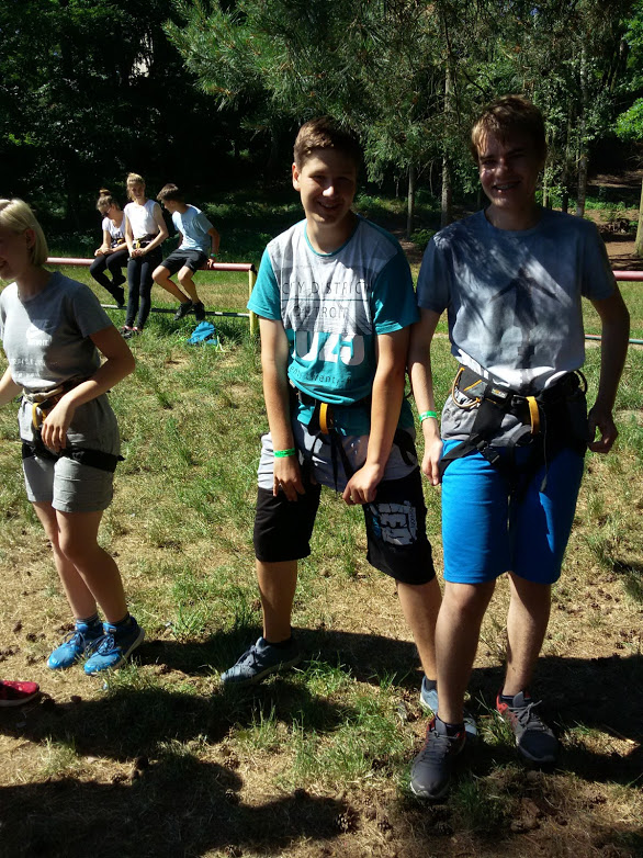 Sympatický instruktor nám vysvětlil, jak „cvakat“ jisticí karabinky na našem úvazu na ocelové lano u překážek ve větvích borovic, každému upevnil sedák a hurá po žebříku vzhůru na okruh překážek. Téměř všichni jsme absolvovali lanovou dráhu. Museli jsme překonat sama sebe. Moc chválím ty, kteří pomáhali kamarádům.
