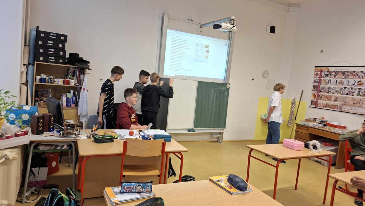 ...učili jsme i na prvním stupni. Vašík, Ráďa i Kuba tělocvikovali, Lucka s Týnou a Kája s Klárkou trénovali druháky. Kája se podívala i ke třeťákům. A v sedmičce projevili své pedagogické talenty na matematice Kryštof s Kubou, na češtině Kája s Klárkou, angličtinu si střídali Štěpán s Adamem a Ondrou, na přírodopis se připravil Tonda s Kryštofem a suplovanou hudebku Daník s Pavlíkem a Slávkem.