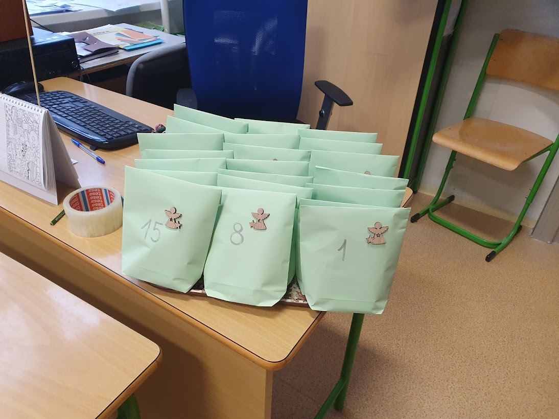 Těšili jsme se s dětmi na vánoční pohodu a chtěli jsme sobě i dětem to očekávání zpříjemnit. S paní asistentkou jsme připravili překvapení ve formě balíčků připomínajících adventní kalendář. Náš záměr, aby každé dítě dostalo balíček se drobnostmi, hatil jen občasný odchod některého jednotlivce do karantény nebo onemocnění.