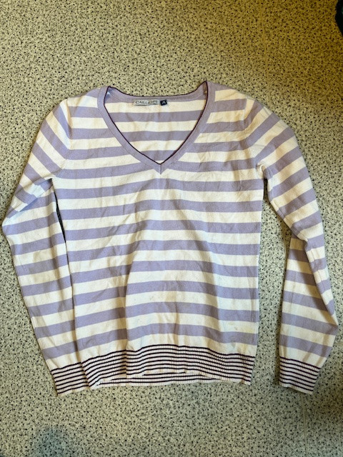 249Béžový propínací svetr s bílými pruhy na rukávech