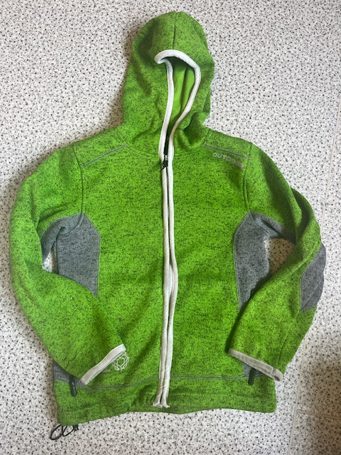 254Šedá žíhaná teplá mikina s kapucí a svítivě zelenými zipy