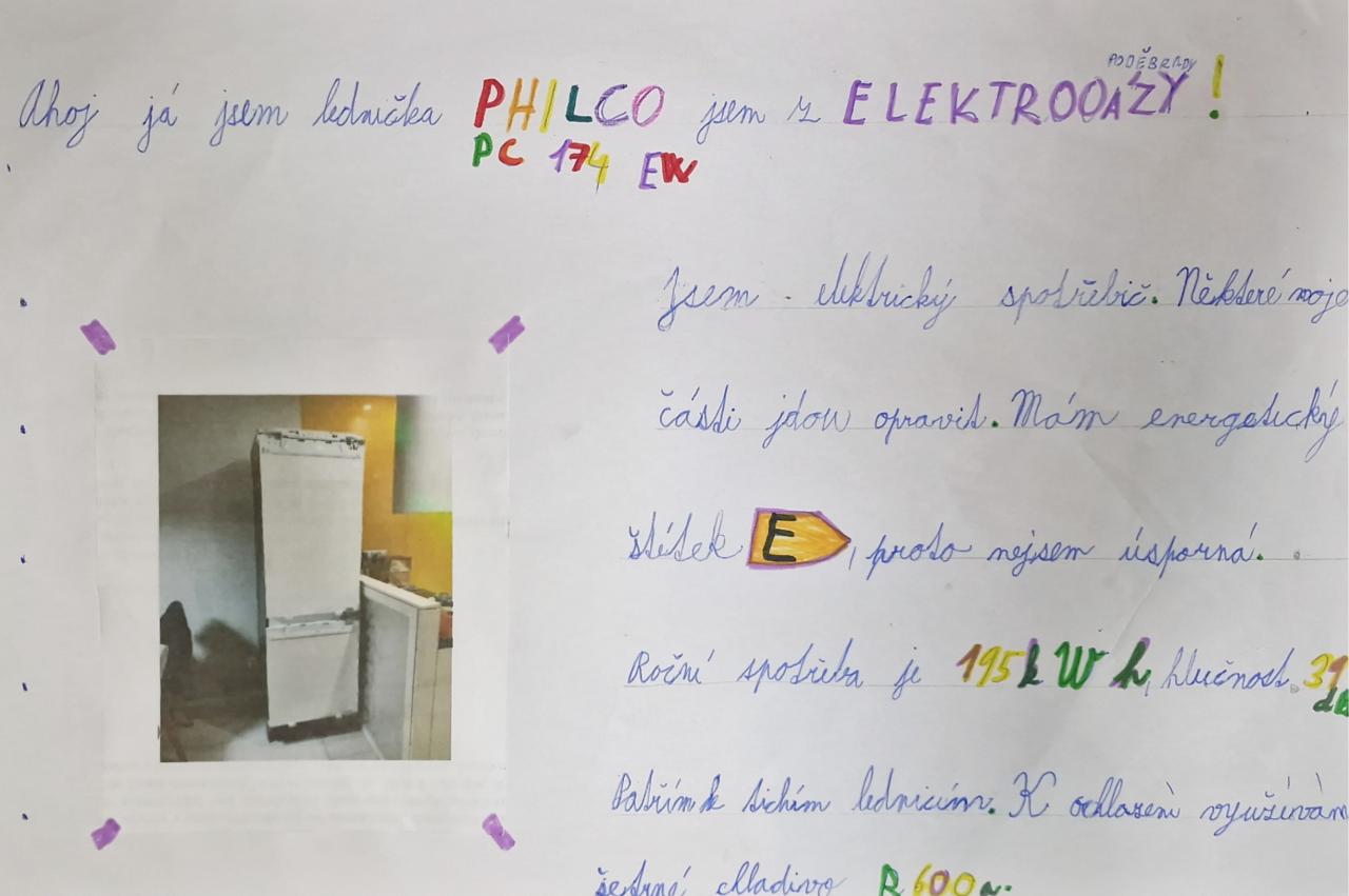Školní Ekotým se i v letošním školním roce účastní programu Recyklohraní. V rámci tohoto programu žáci tvořili příběh elektrospotřebiče se zaměřením na jeho původ, vhodné využití, životnost a jeho recyklaci. Mezi nejlepší práce patří např. práce Terezky a Karolíny na fotografii.