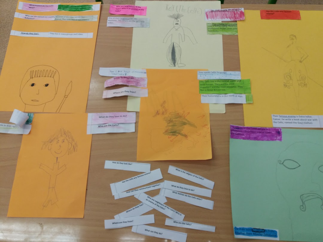 Hodina proběhla bilingvně - každé dítě dostalo lísteček s otázkou nebo odpovědí. Barevně jsme si otázku a odpověď odlišili, aby následující úkol nebyl tolik obtížný. Po krátkém přemýšlení o překladu větiček musely děti najít správnou dvojici, četly si vzájemně věty, potom nahlas i s překladem, hledaly v učebnici nebo na internetu obrázek, který by odpovídal jejich dvojici vět. Vzájemně jsme složili mozaiku ze života Keltů. Hodinu jsme odlehčili kratičkým dokumentem o Keltech. Následně se děti sdružily do větších skupin, nakreslily jednoduchý obrázek ke svému tématu a nalepily své věty.