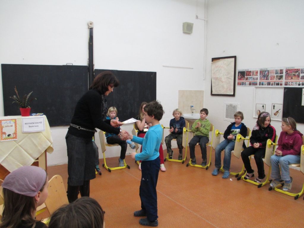 Každoročně se konají ve dvou kolech. V prvním třídním si žáci básničky vybírají, seznamují se s obsahem, učí se texty a recitují. Nejúspěšnější postupují do školního kola, které se letos konalo 14. 2. 2013. Probíhalo v příjemné a slavnostní atmosféře. Celkem soutěžilo třicet recitátorů a to nejen o vítězné diplomy a sladké odměny, ale také o postup do okresní přehlídky „Dětská scéna“ – Kolín.